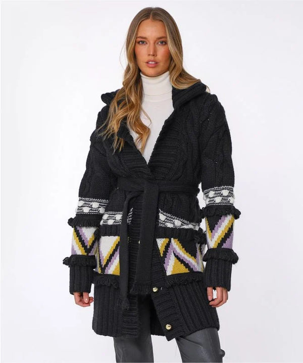 MERINO CABLE JACQUARD MIDI CARDIGAN BLACK